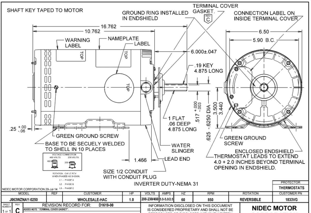 Commercial Condenser Fan Motor for applications using a variable frequency drive. Wiring diagram on motor name plate. OAO = Open Air-Over, J063NAY0250015B