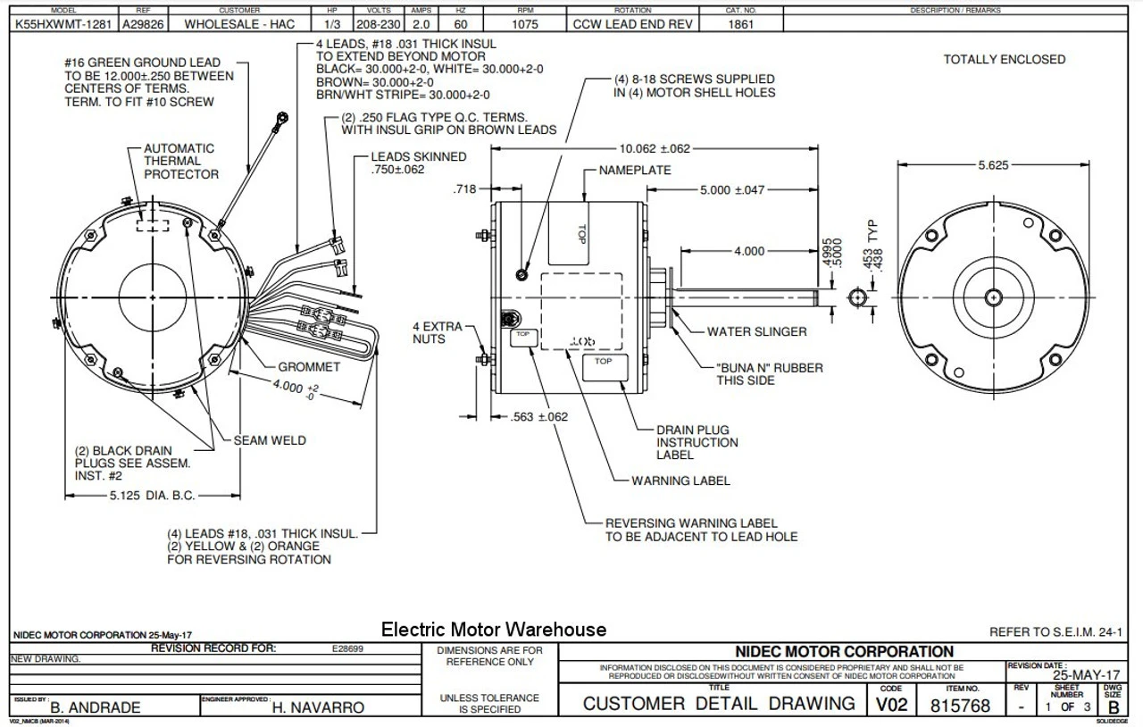 Permanent Split Capacitor Motor. Automatic Overload Protection. Continuous Duty; Totally Enclosed Air Over Enclosure; Class B Insulation; 60C Ambient Temperature; 30″ Leads,ย K055WMT1281012B