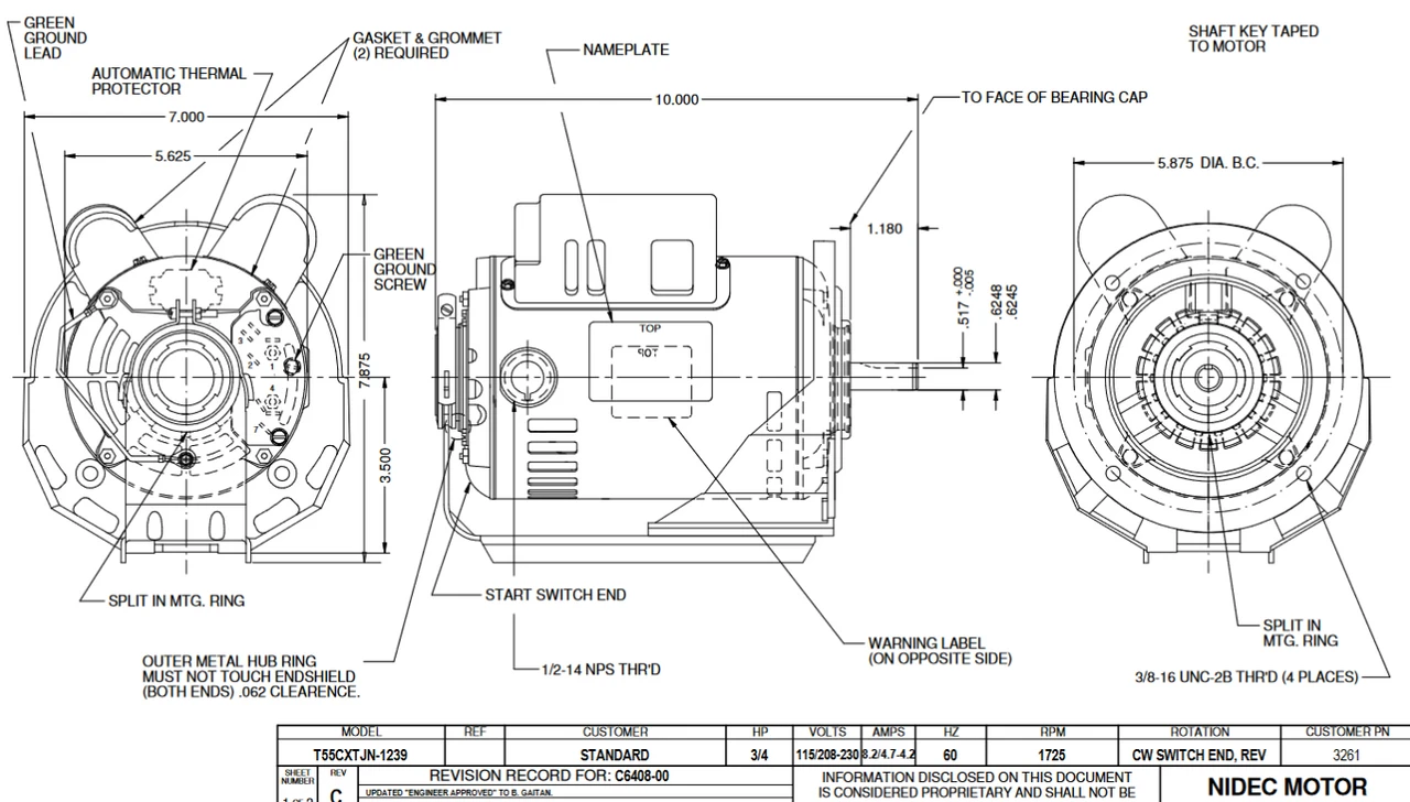 3/4 hp 1725 RPM, 8.2/4.7-4.2 amps 115/208-230 Volts 60 Hz Capacitor Start Motor