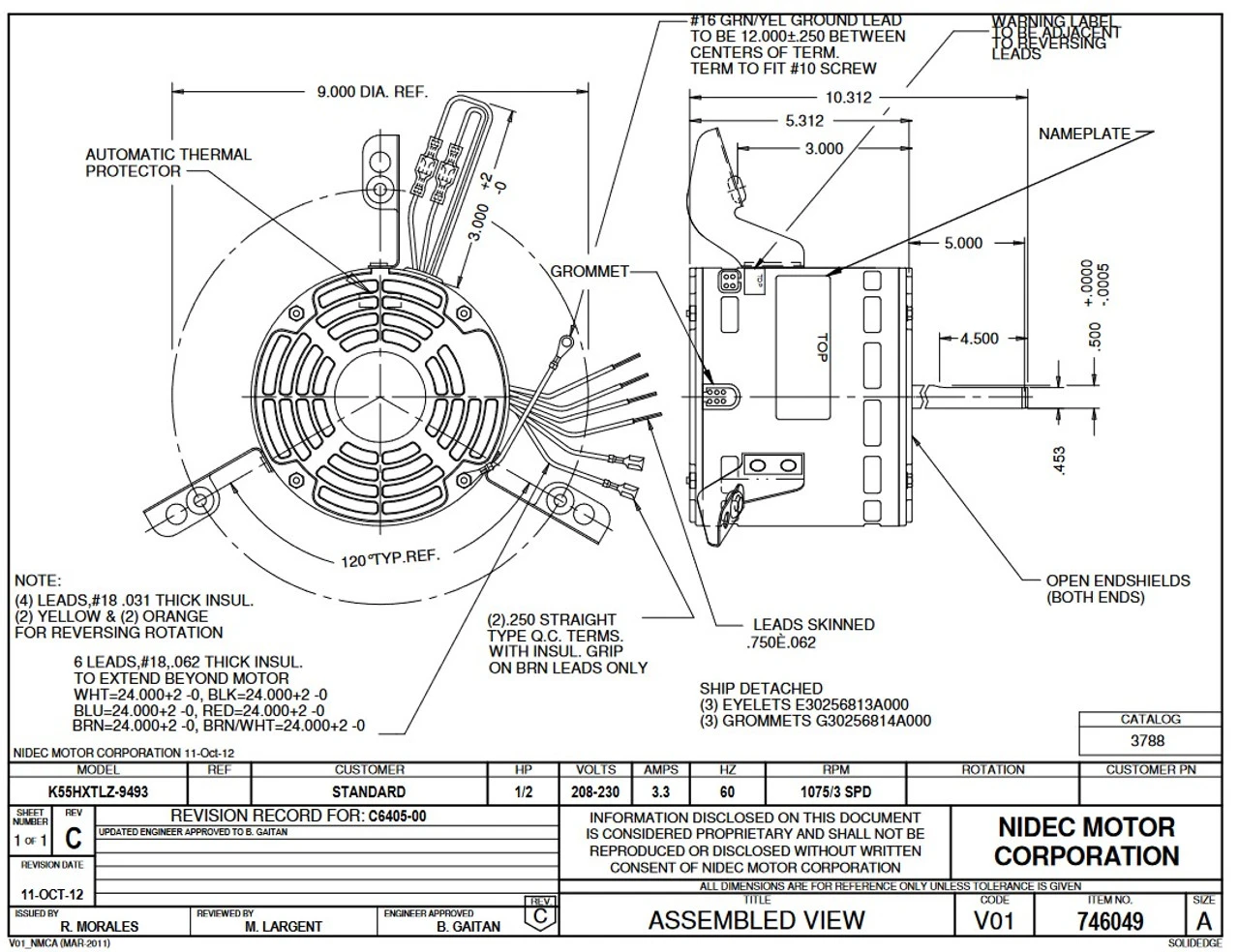 Permanent Split Capacitor Motor. Automatic Overload Protection. Continuous Duty; Open Air Over Enclosure; Class B Insulation; 40C Ambient Temperature; 24″ Leads, 60 Hertz. K055TLZ9493012B.