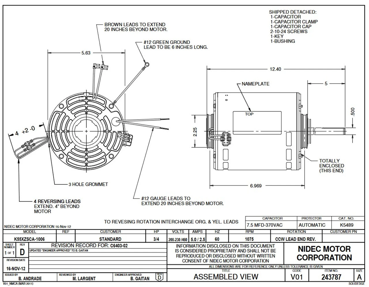 Permanent Split Capacitor Motor. Automatic Overload Protection. Continuous Duty; Open Drip Proof Enclosure; Class B Insulation; 40C Ambient Temperature; K055SCA1006892B