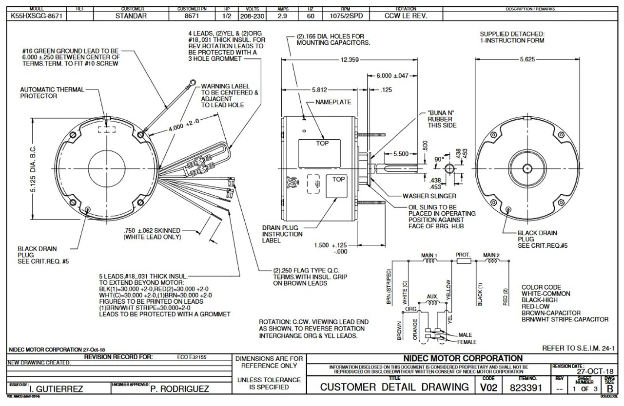Permanent Split Capacitor Motor. Automatic Overload Protection. Continuous Duty; Totally Enclosed Air Over Enclosure; Class B Insulation; 40C Ambient Temperature; 30″ Leads, KA55SGG8671802B