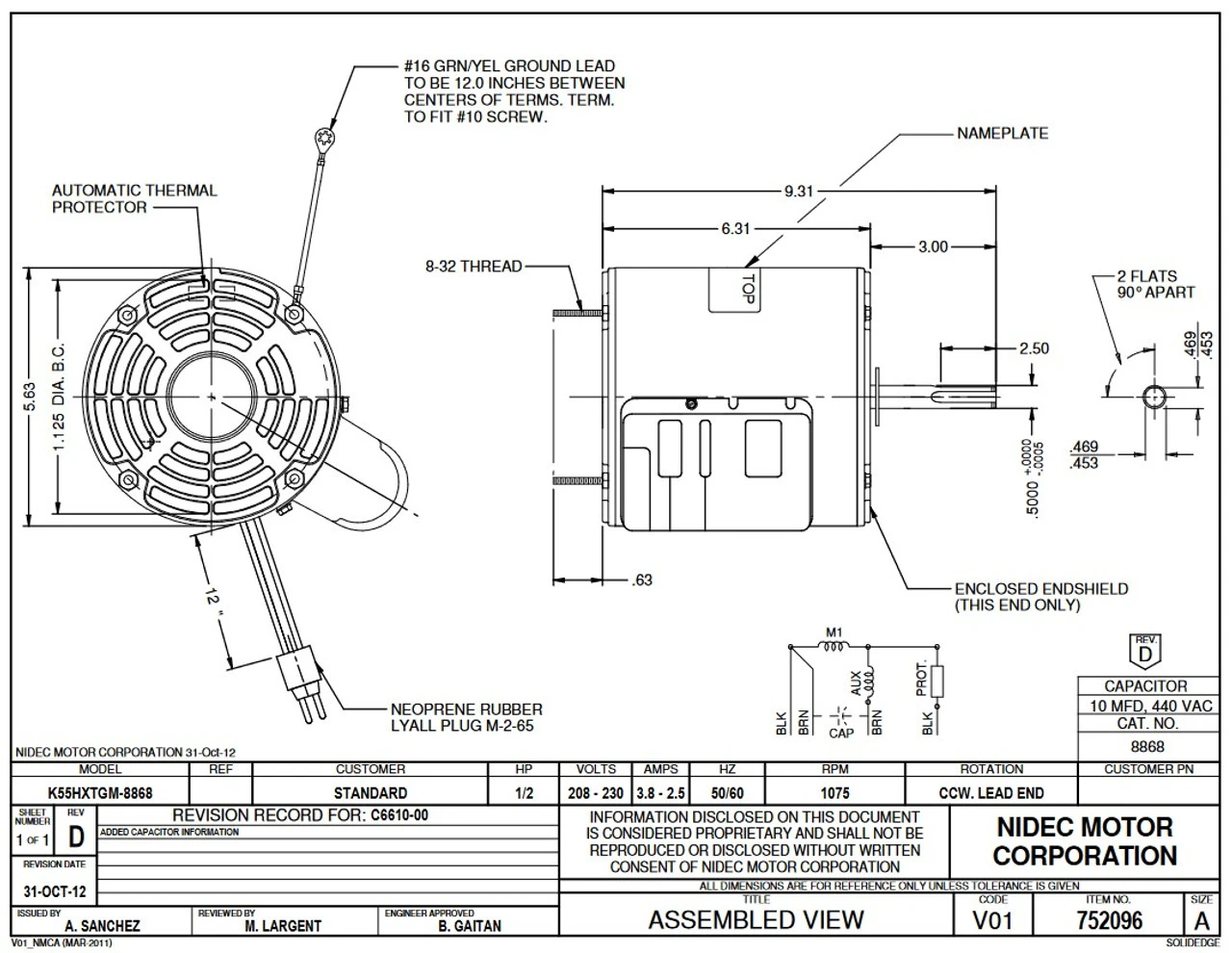 Permanent Split Capacitor Motor. Automatic Overload Protection. Continuous Duty; Totally-Enclosed Enclosure; Class B Insulation; 40C Ambient Temperature; Conduit box, K055TGM8868011B