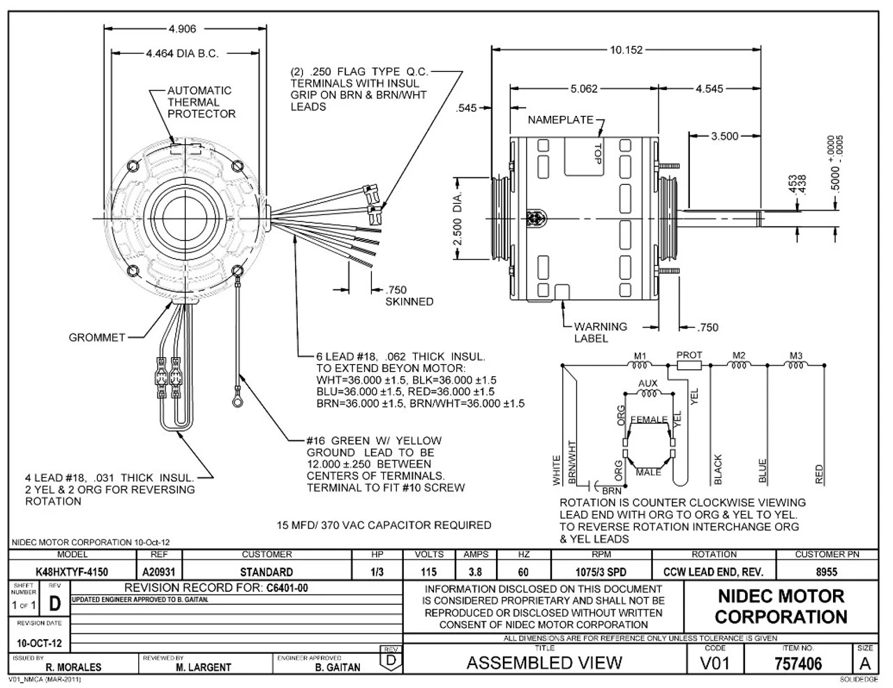 Permanent Split Capacitor Motor. Automatic Overload Protection. Continuous Duty; Open Drip Proof Enclosure; Class B Insulation; 40C Ambient Temperature; 36″ Leads. K048TYF4150012Bย