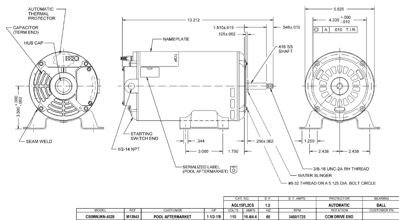Above ground swimming pool and spa motors. 48Y frame motors thru bolt dimension is 5 1/8″ on center measured across the shaft. Wiring connection diagram on motor name plate. These motors are found on the Hayward Powerflo, Waterway, Aquaflo, Dynamo and many other above ground pool and spa pumps. 1 Year Manufacture Warranty. C055JKN4528013J