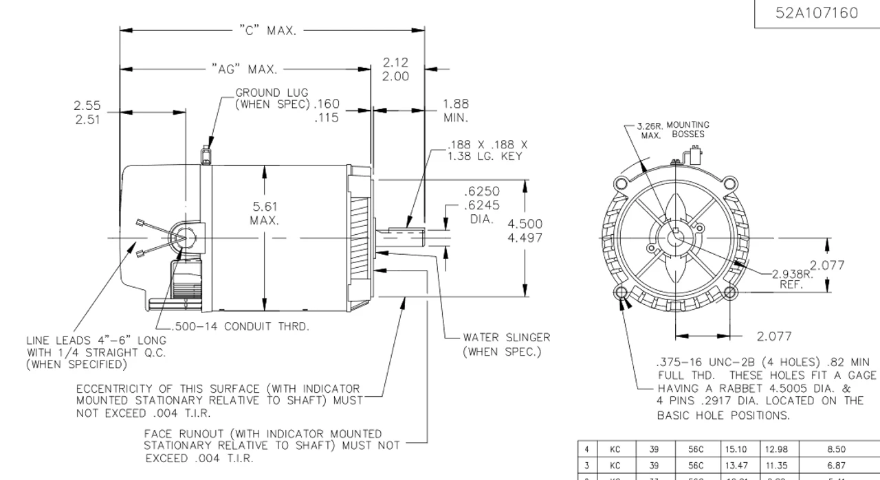 - NEMA 56C Frame, 5’8″ dia. by 1-5/8″ long keyed shaft, 60 Hz
