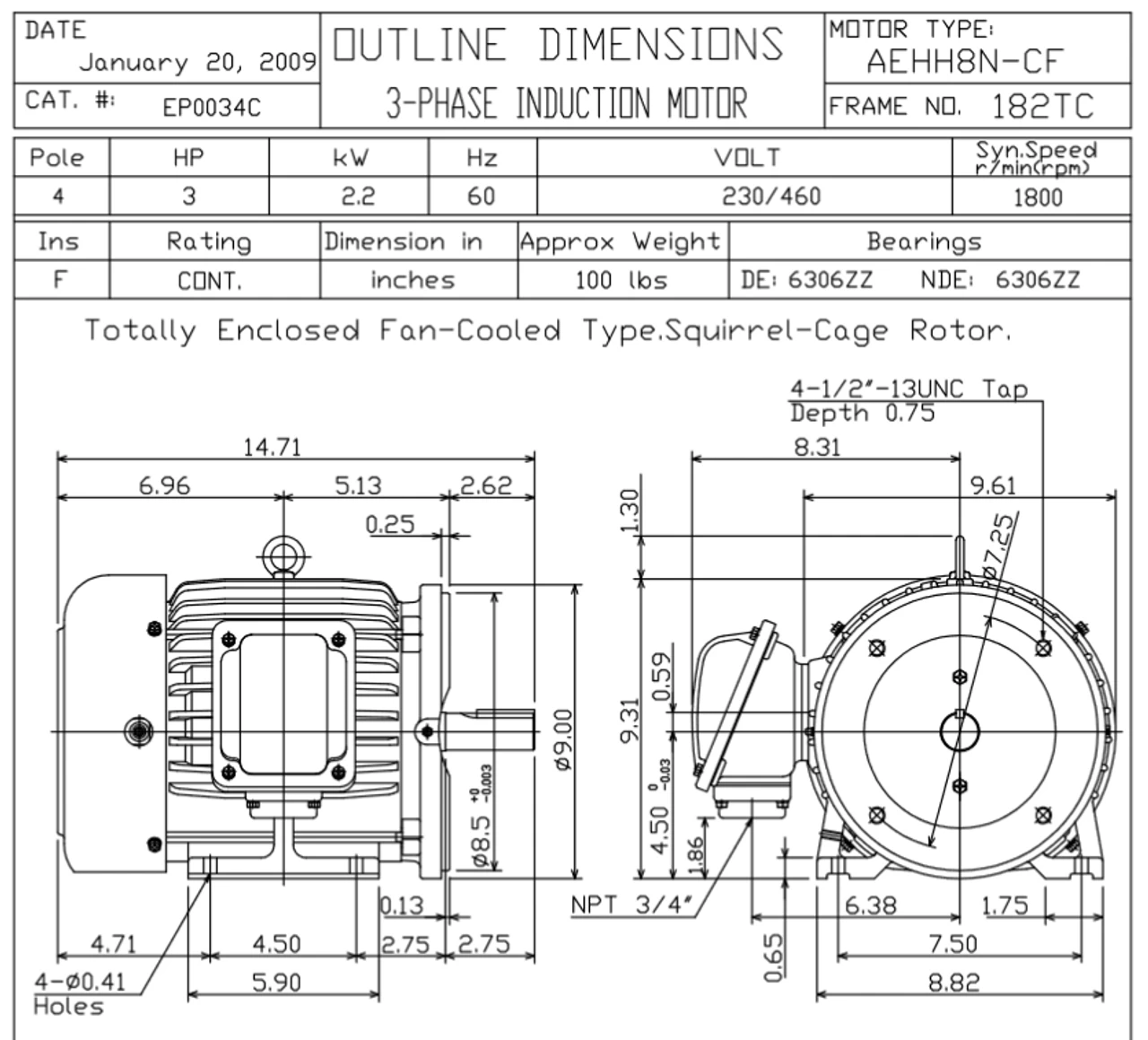 - NEMA 182TC Frame, 2 3/4 x 1 1/8″ Dia. Keyed Shaft