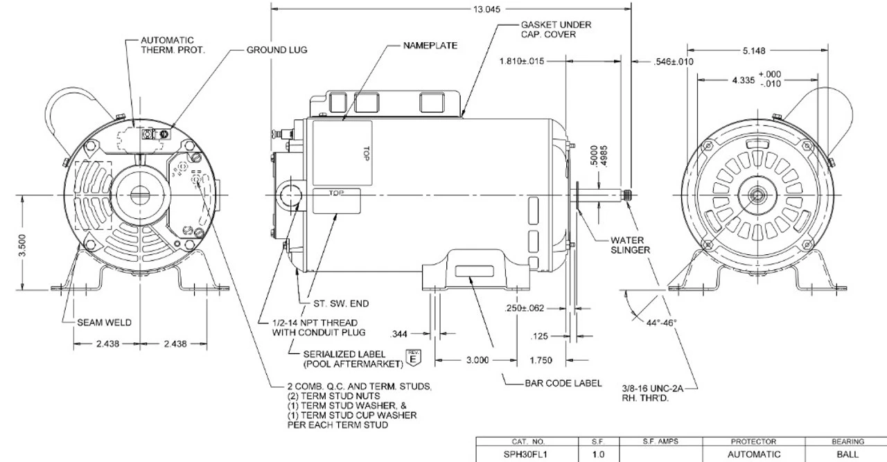Above ground swimming pool and spa motors. 48Y frame motors thru bolt dimension is 5 1/8″ on center measured across the shaft. Wiring connection diagram on motor name plate. These motors are found on the Hayward Powerflo, Waterway, Aquaflo, Dynamo and many other above ground pool and spa pumps. 1 Year Manufacture Warranty.ย T055BNN1009013J