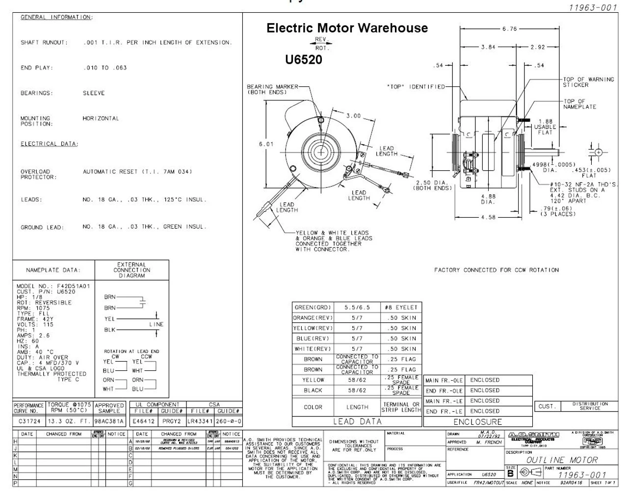 - 1/8 hp, 1075 RPM, 2.6 amps, 115 Volts